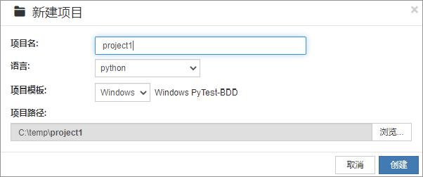 启动CukeTest后,选择“新建项目”,输入项目名称,并选择合适的脚本语言(例如Python)和项目模板(Windows模板)。