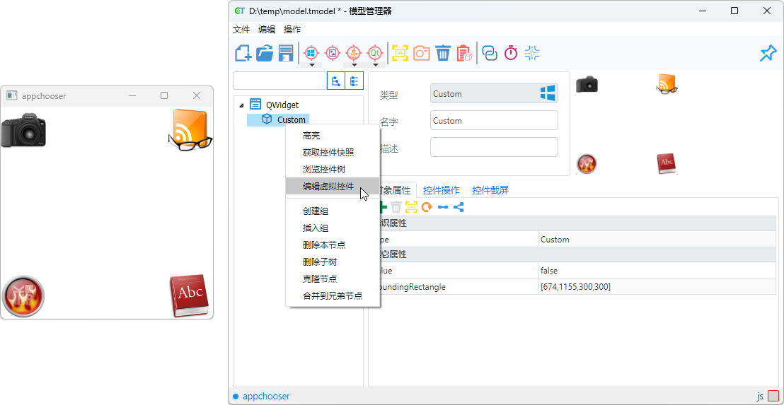First, identify the entire window control in the Model Manager. For example, the type of this window isCustom. After identification, the window object will be displayed in the object tree, and subsequent virtual controls will belong to this object.Edit Virtual Control
