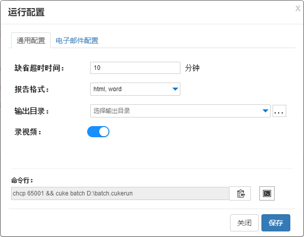 - 运行配置: 修改批量运行的全局配置,包含报告格式、输出目录、视频录制以及邮件通知等设置。