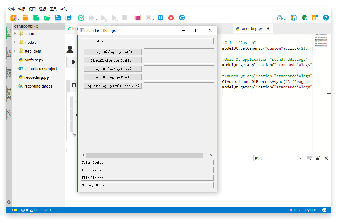 这里我们使用CukeTest自带的样例应用standarddialogs.exe,录制一个操作文本对话框的场景: